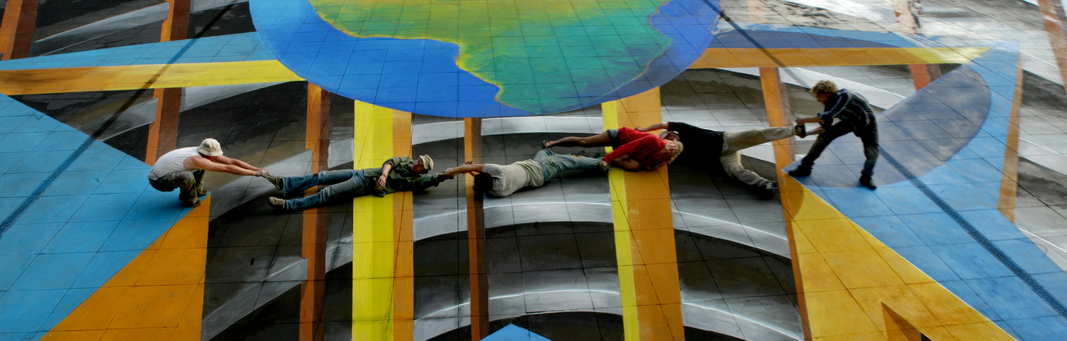Anamorphic, or 3D pavement art, was invented by Kurt Wenner in 1984. By adapting the Renaissance techniques of perspectival anamorphosis, Wenner was able to transfer the illusion of soaring architecture and floating figures from the ceiling to the ground below. Using a new geometry with oblique angles he was able to create compositions that appear to rise from, or fall into, the ground.
