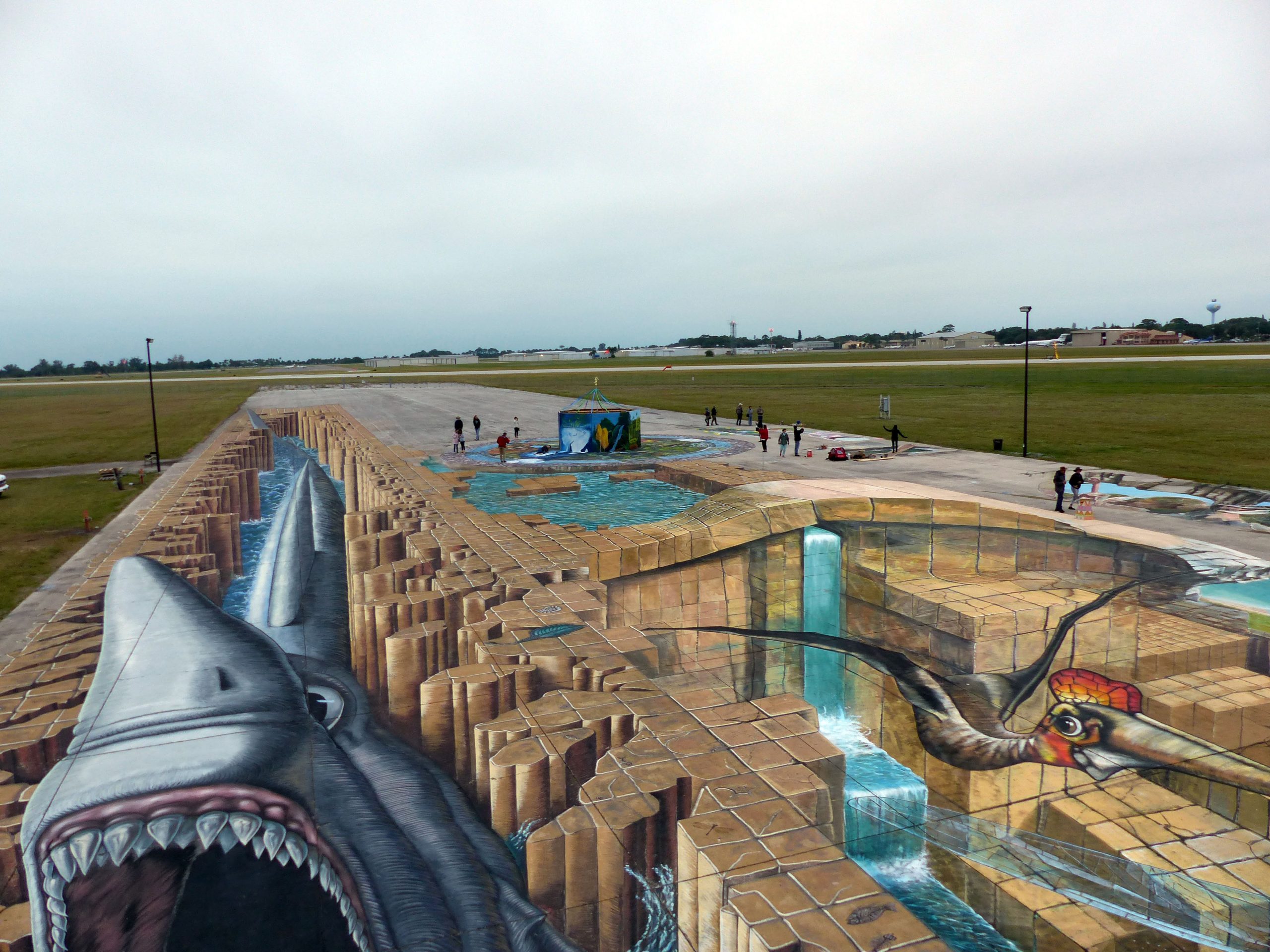 The Chalk Festival in Venice created, with a talented team of pavement artists, local artists, students and volunteers, the Largest Anamorphic Pavement Art in the World at the Venice Airport Festival Fairgrounds in November 2014. Denise Kowal, the festival founder and chair, had the vision for the Guinness attempt in August and quickly assemble a team that came together by October 31st. She hired Kurt Wenner, the innovator of 3D pavement Art, to create the design incorporating the extinct Megalodon Shark to honor the 2014 festival theme ‚Extinct and Endangered Species,‘ and to also honor the Island of Venice’s history as the Shark’s Tooth Capital of the World. She hired Julie Kirk, one of the first female pioneers of the art form, to lead the team of artists. When the title is secured for this painting, it will be the first time the USA has held the title.