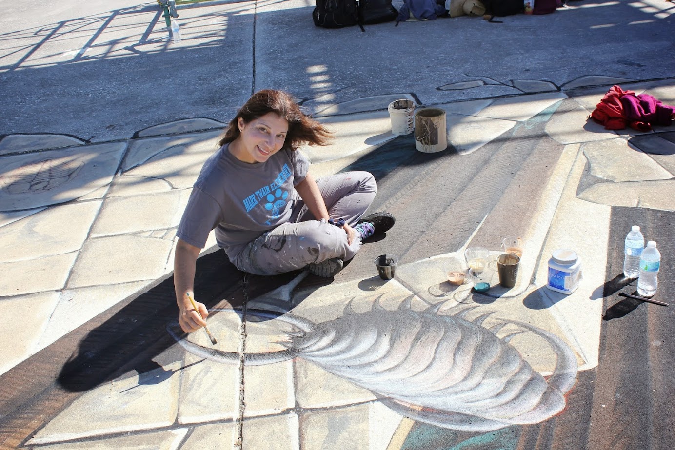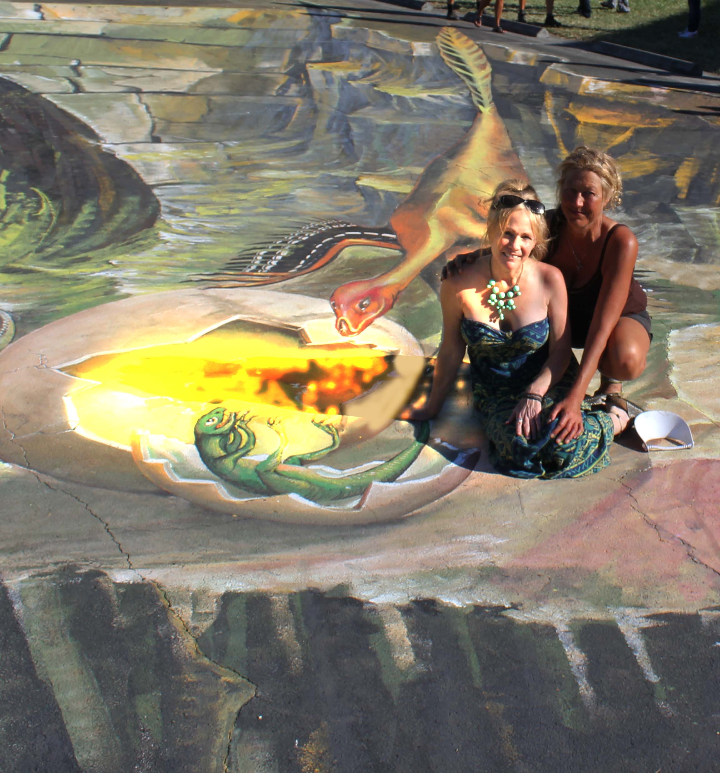 Julie Kirk is a renowned artist and author of „Sidewalk Canvas: Chalk Pavement Art at Your Feet“, the first book published about street painting as an art form.