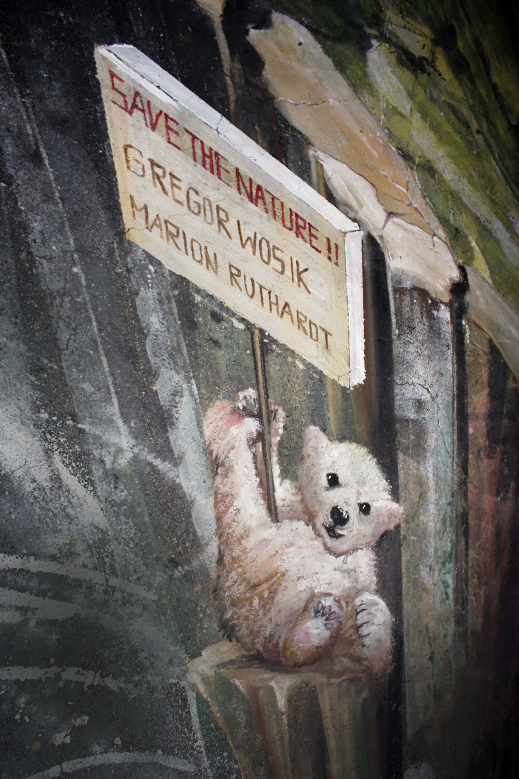 2019 mußten wir den Haifisch noch einmal auffrischen. Gregor Wosik malte bei der Gelegenheit sein eigenes Werk direkt neben den Hai , und vergrößerte dadurch noch das Bild. Wenn man genau in den Hintergrund schaut, sieht man mich da auf meinem gemaltem Tiger herum springen. Die Tiger im Loch habe ich nach unserer Arbeit an dem Urzeit Hai gemalt.
