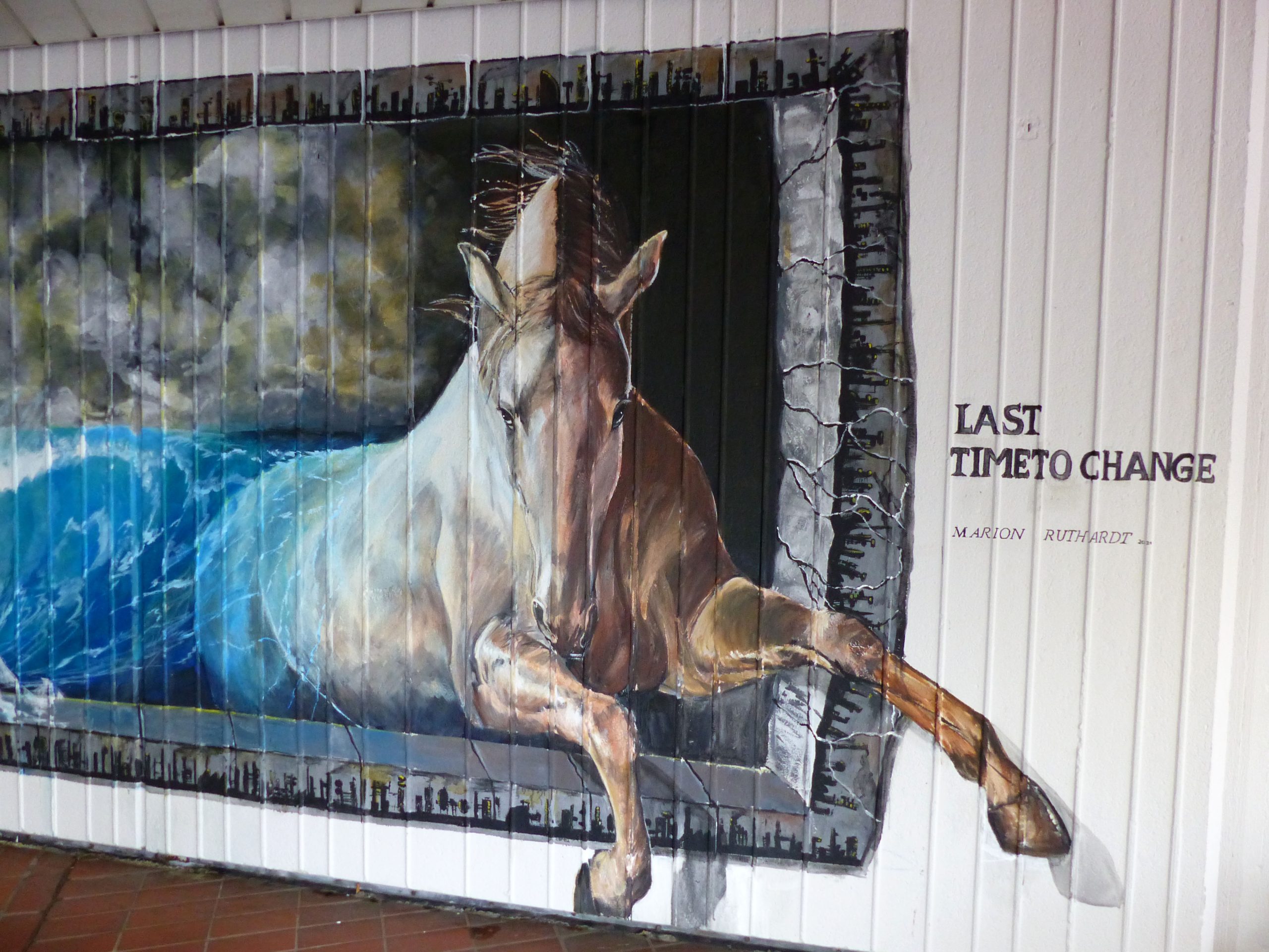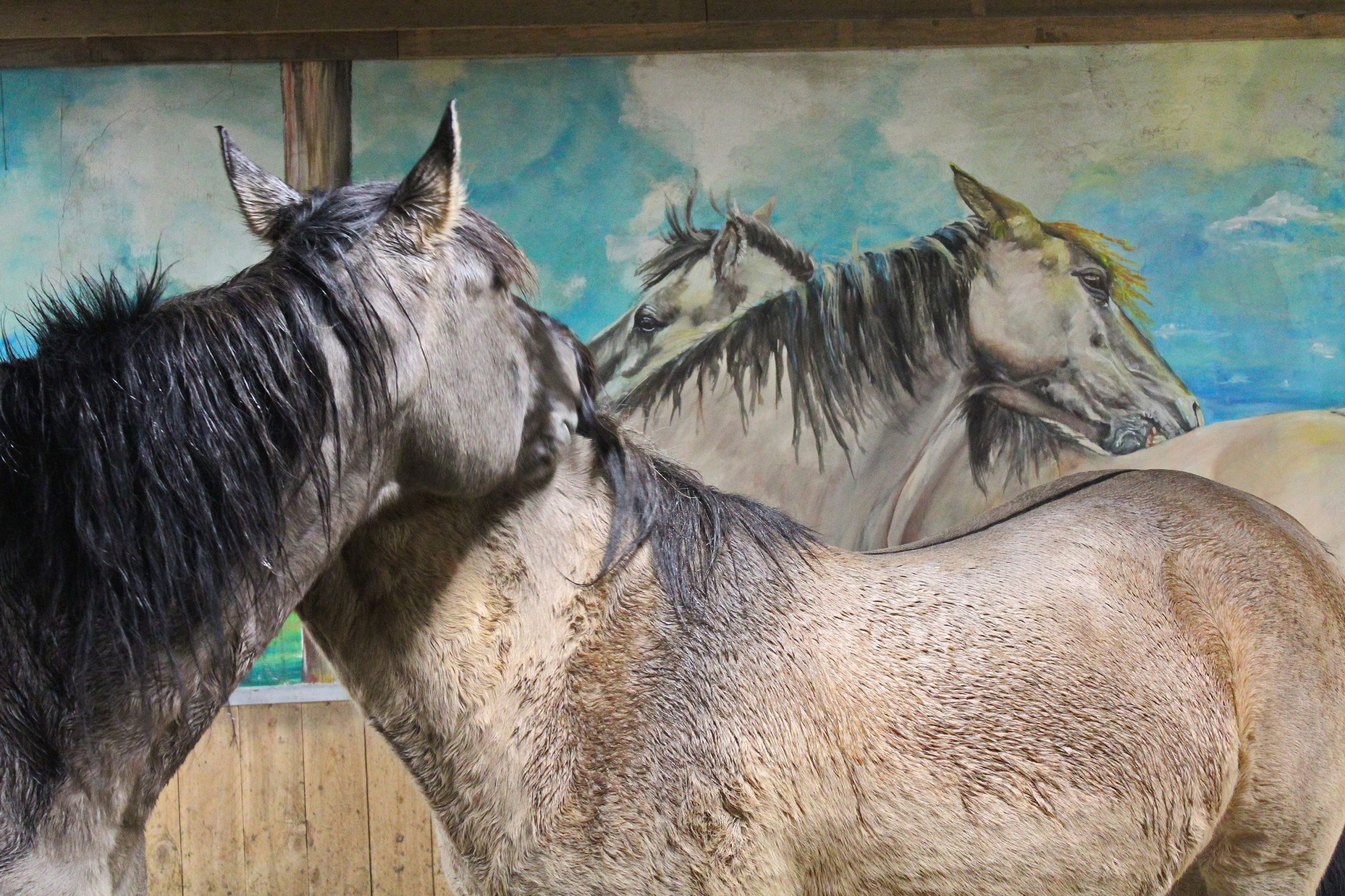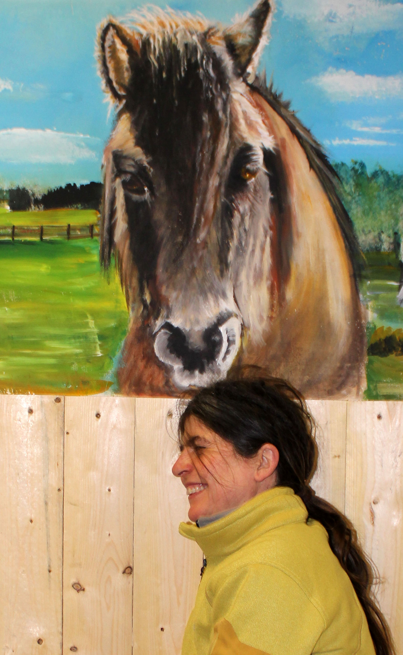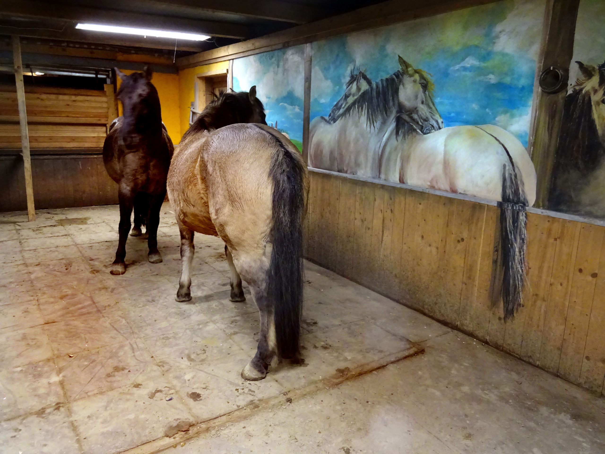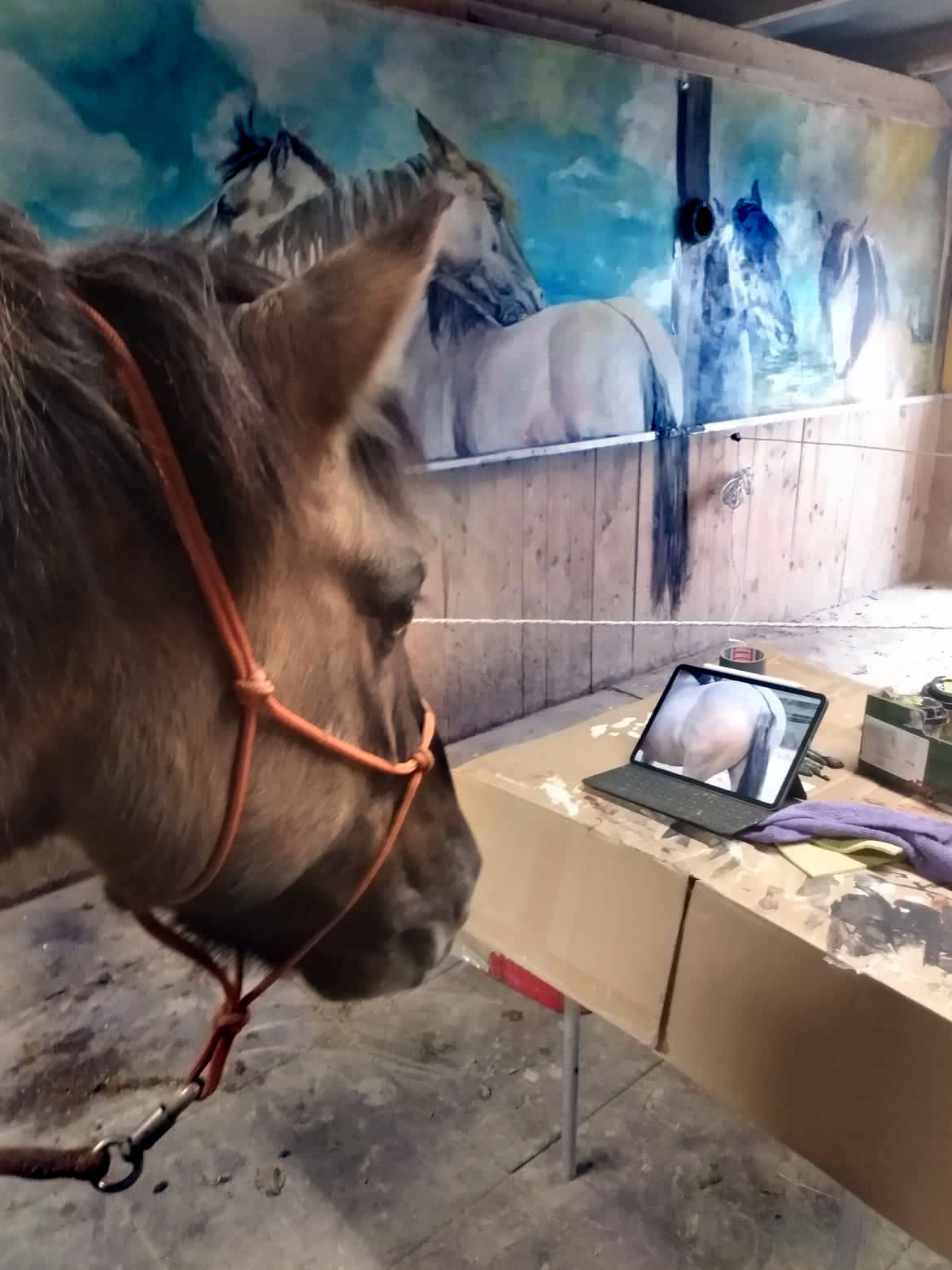 Meine neue Lieblingsarbeit, Malen im Stall! Diese Idee hatte Sabine Reuß , https://steckenpferd-reitwege.com/startseite/ und ich verewigte ihre Tiere an der Wand.