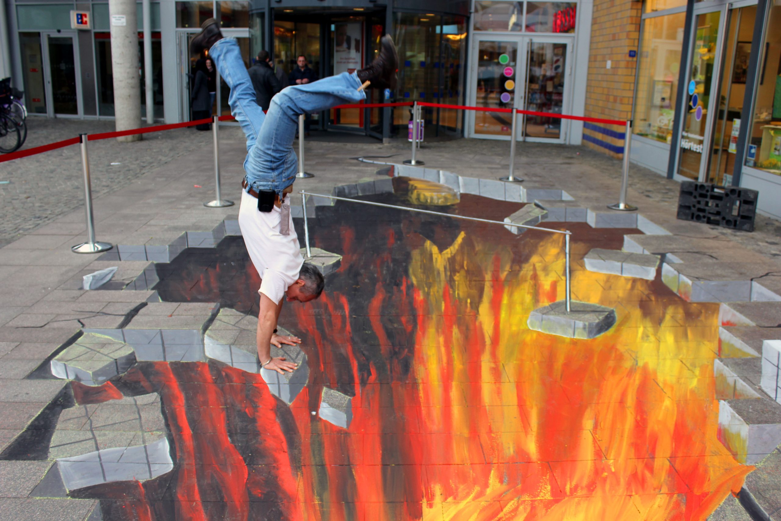 Der Platz war eine Steilvorlage, direkt neben der Deutschen Bank in Wesel. Zum Stadtfest. So ein Bild wollte ich schon immer mal malen. Fun-Fact: der Sponsor war die Sparkasse 🙂 Leider hielt das Bild nur 1 Nacht, es sollte mit eher wasserlöslichen Farben gemalt werden —und in der Nacht kam strömender Regen….