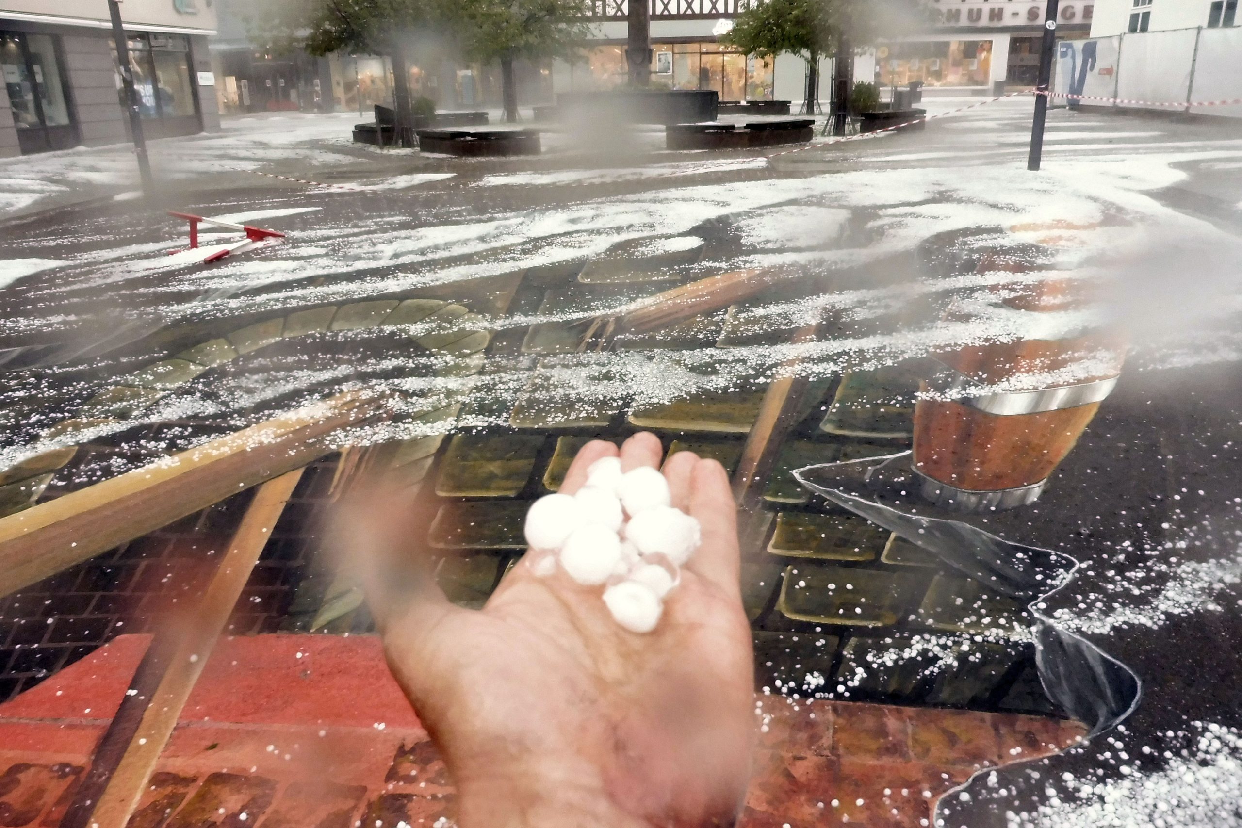 Man erlebt ja kuriose Dinge, in dem Künstler Leben. Hier malte ich im Juni, in Kirchheim unter der Teck. Plötzlich stand ich mit meiner kurzen Hose im Schnee-Hagel. Links auf dem Bild sieht man Bildschirme, usw, denn es war gerade die Fußball Weltmeisterschaft, und es wurde gerade für Public Viewing aufgebaut….Auf der Autobahn gab es katastrophale Zustände, und als ich dann aufgab, und zu meiner Wohnung fuhr, 10 km weiter –wußte die Vermieterin gar nicht, wovon ich rede. Denn dort herrschte normale Juni -Hitze…