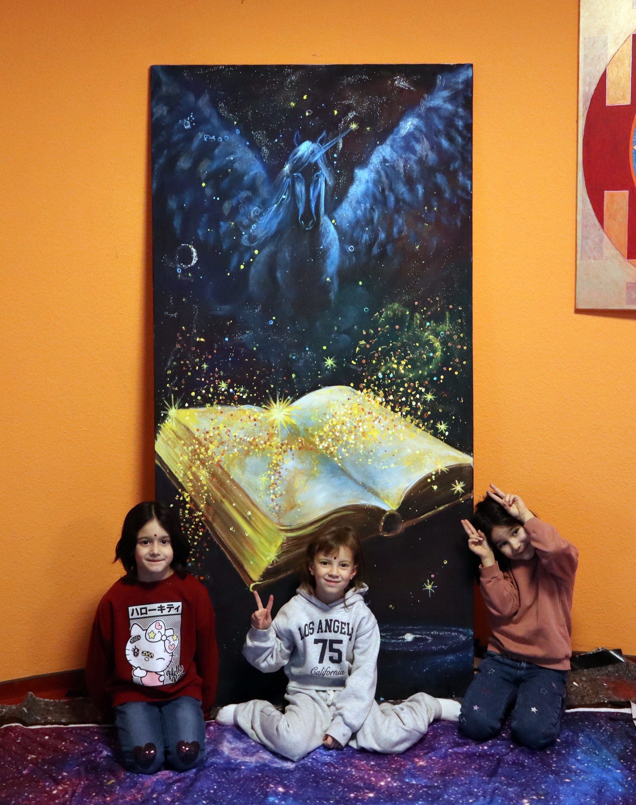 Dazu muß ich allerdings sagen, daß ich gerne ab und zu Kinderworkshops mache, um der Welt auch etwas von meinem Geschenk, –den  Lebensunterhalt auf so eine schöne Weise zu verdienen –zurück zu geben. Insgesamt male ich aber lieber selbst 🙂