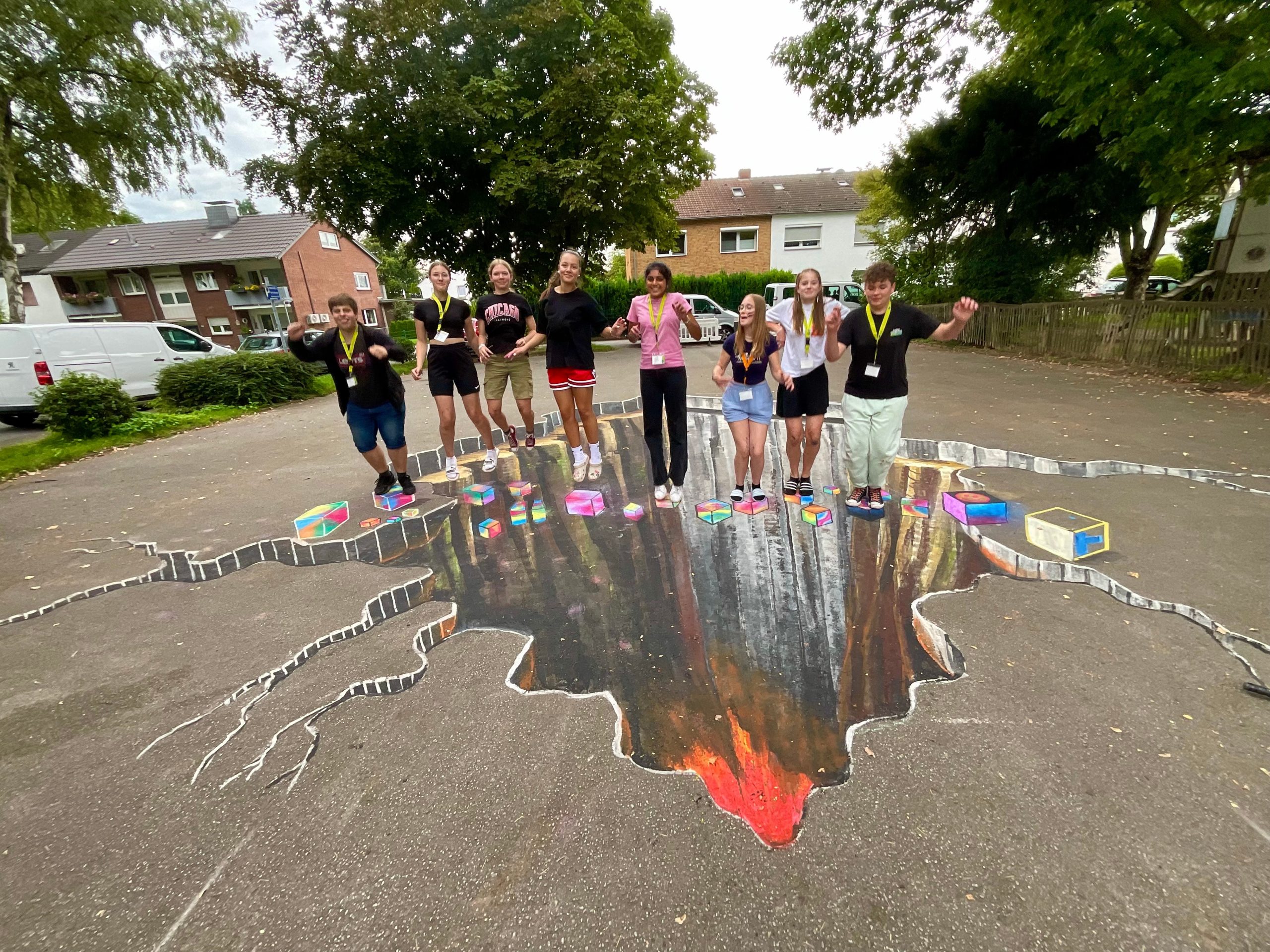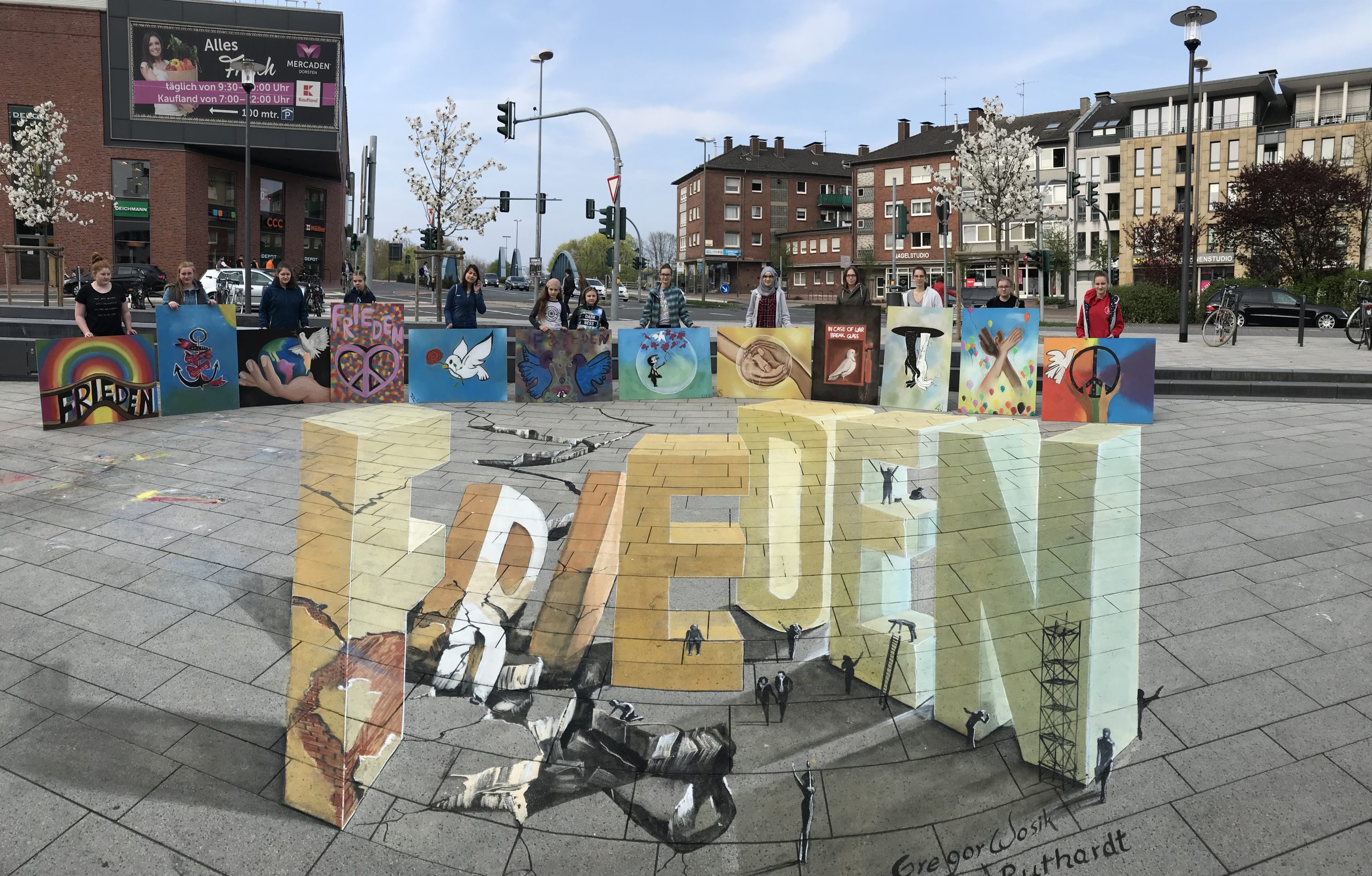 Zuerst malten Gregor Wosik und ich ein dreidimensionales Bild zum Thema Frieden. Danach leiteten wir 15 Mädchen verschiedener Nationalität an, selbst ein Bild zum Thema „Frieden“ zu malen.Die Mädchen arbeiteten konzentriert und intensiv, und das Ergebnis war berührend. Eine Jury , bestehend aus dem Bürgerbeister Tobias Stockhoff, Dechant Ulrich Franke und der Künstlerin Rosi Soggenberg sollten die schönsten Bilder auswählen, und standen vor einer unslösbaren Aufgabe. Sie erklärten alle Mädchen zu Gewinnern.