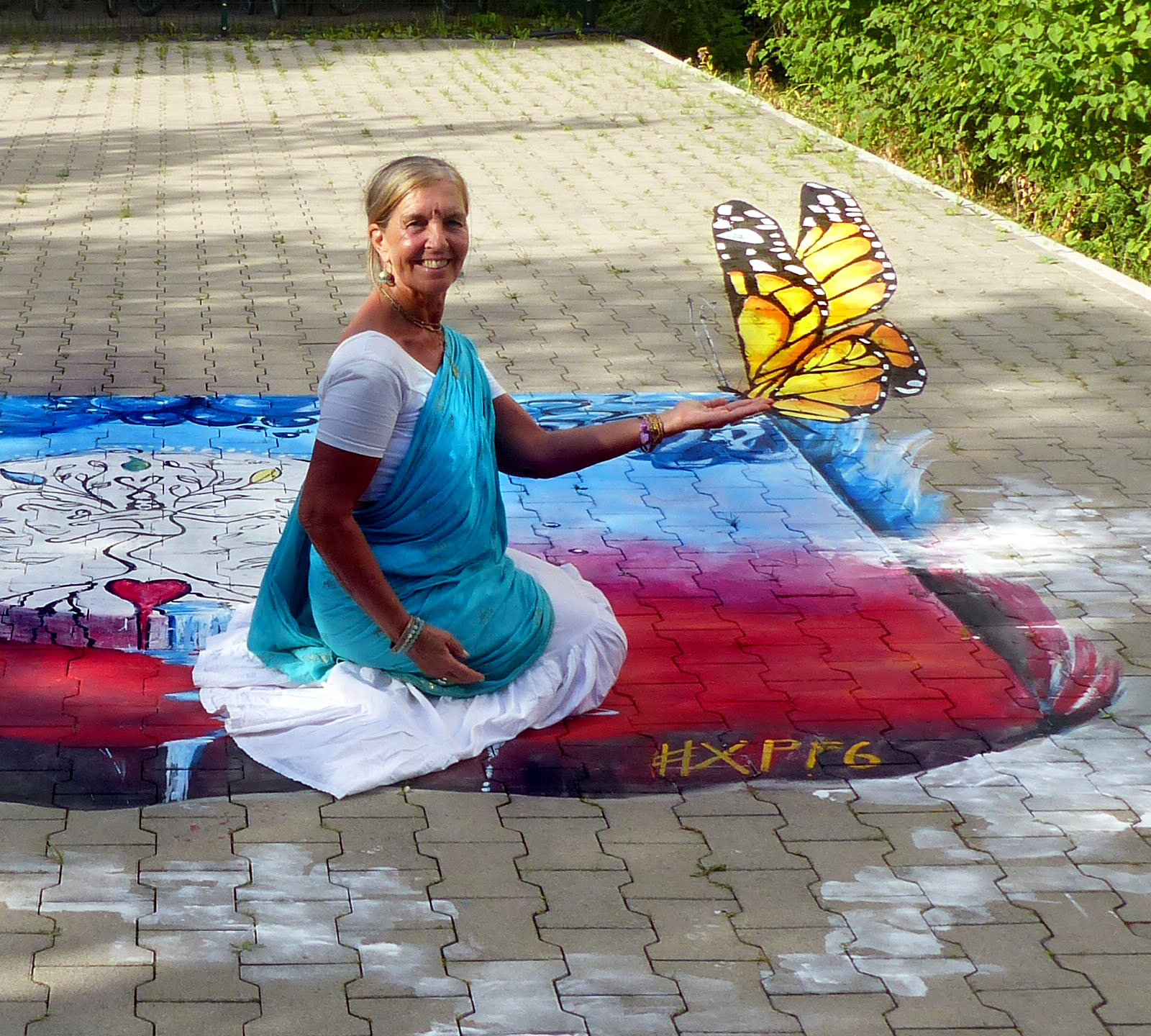 Links und oben meine Malerei für das Experience Festival bei Yoga Vidya. https://www.xperience-festival.de/  Es gibt sehr viele Angebote, mit den Themen Yoga, Heilung, Spiritualität, Lebenshilfe, Musik, gutes, veganes Essen und eben auch Malerei auf dem Festival. Yoga Vidya in Bad Meinberg ist überhaupt ein sehr wichtiger Ort, https://www.yoga-vidya.de/  nicht nur für mich, sondern für Alle, denn es gibt hier sehr viele, friedliche Impulse und eine Unmenge von freundlichen Menschen —das ist eine Erholung in diesen dunklen Zeiten. Oben auf dem fliegenden Teppich steht Sukadev, der Ashram Gründer, der auch sehr viele Neider hat, obwohl er ein ganz bescheidener Mensch ist, der einfach nur das „Gute“ erreichen möchte.
