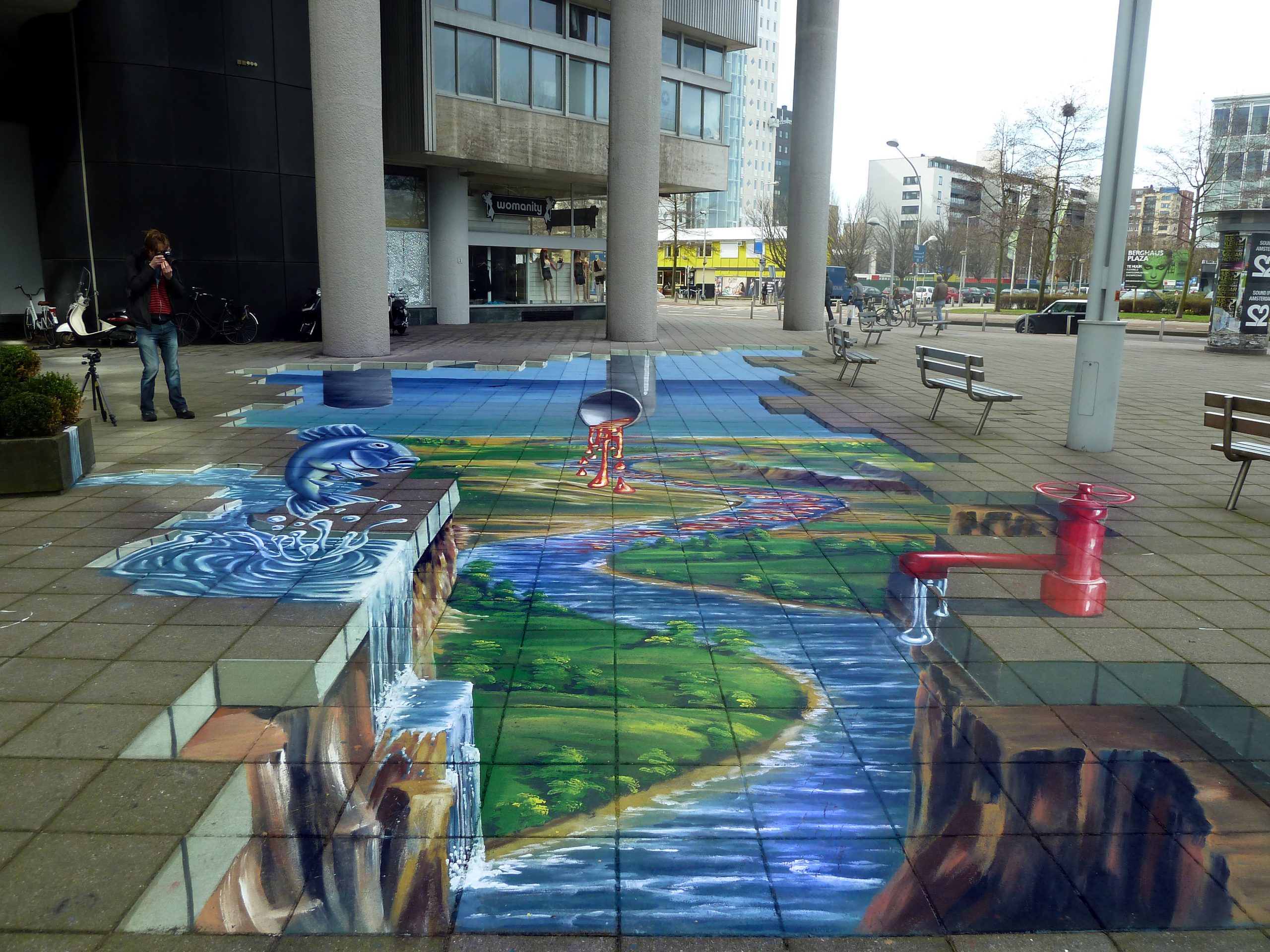 Auch eine tolle Aktion: ein Bild für Greenpeace,https://www.greenpeace.org/nl/ in Amsterdam im Stadtteil Sloterdijk. In Zusammenarbeit mit Gregor Wosik, Ruben Poncia und Remko van Schaik. Organisiert von Peter Westerink. —Diese Greenpeace Kampange richtet sich gegen die extreme Gewässer Verschmutzumg durch Billig – Textilien. bzw durch die Chemikalien, mit denen sie eingefärbt werden. In den asiatischen Herstellungsländern haben die Flüsse ihre natürlich e Farbe verloren, es gibt keine Fische mehr, und trinken kann man das Wasser schon gar nicht. Auch bei uns geraten die hochgiftigen Chemikalien durch das Waschen in den Wasserkreislauf. Zum Glück haben sich schon einige Herseller, wie Adidas und Nike dazu verpflichtet, nur noch ungefährliche Substanzen zu nutzen.