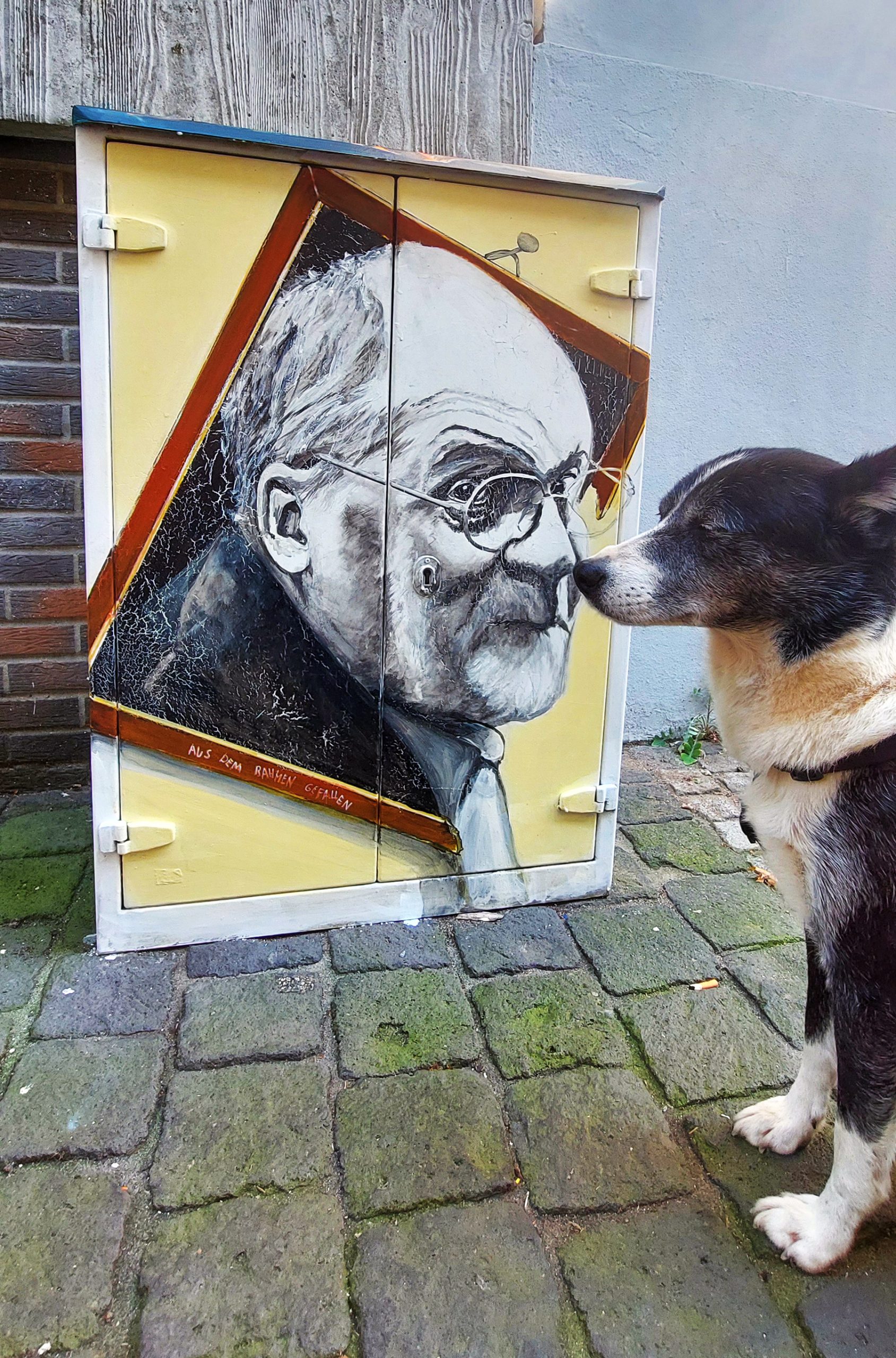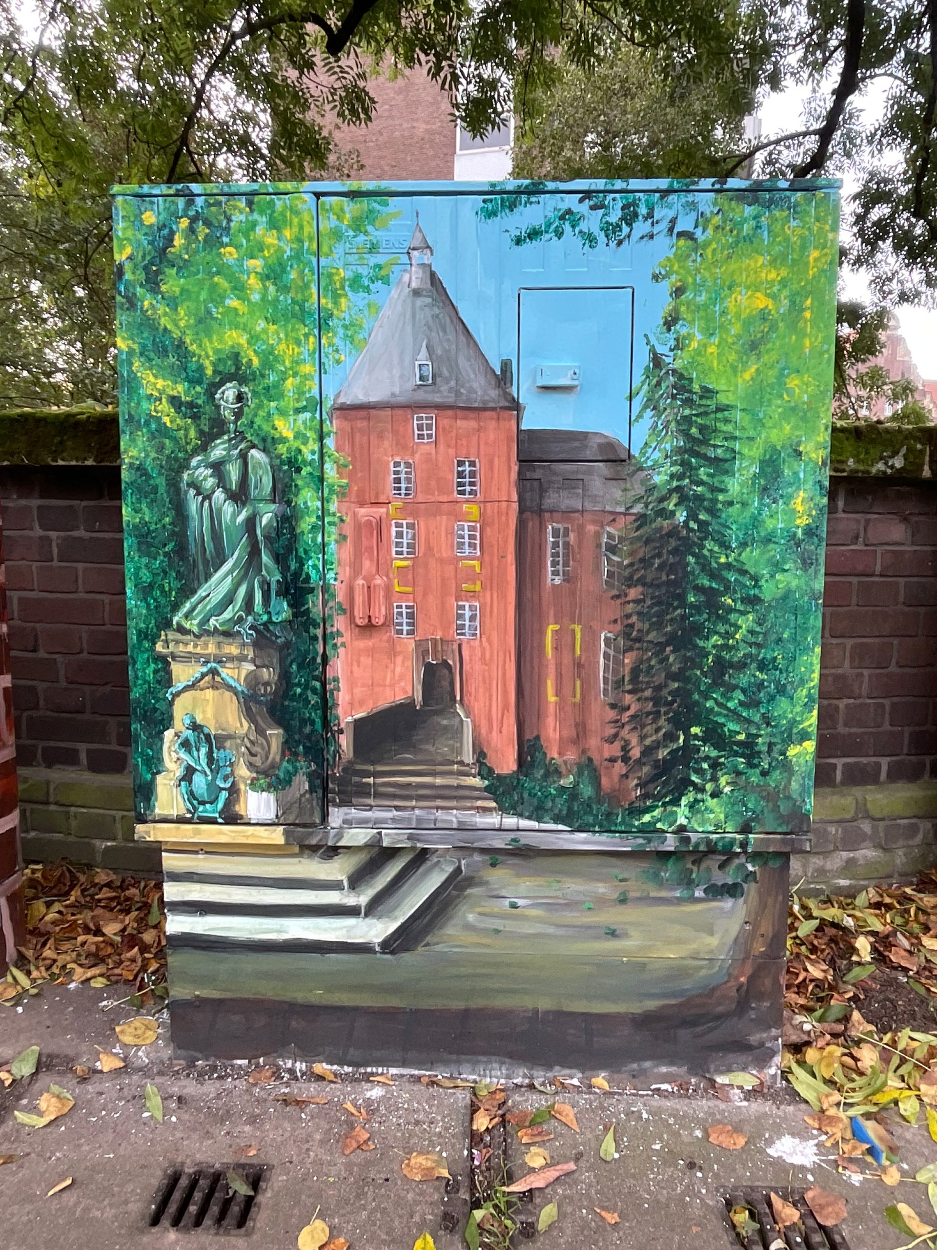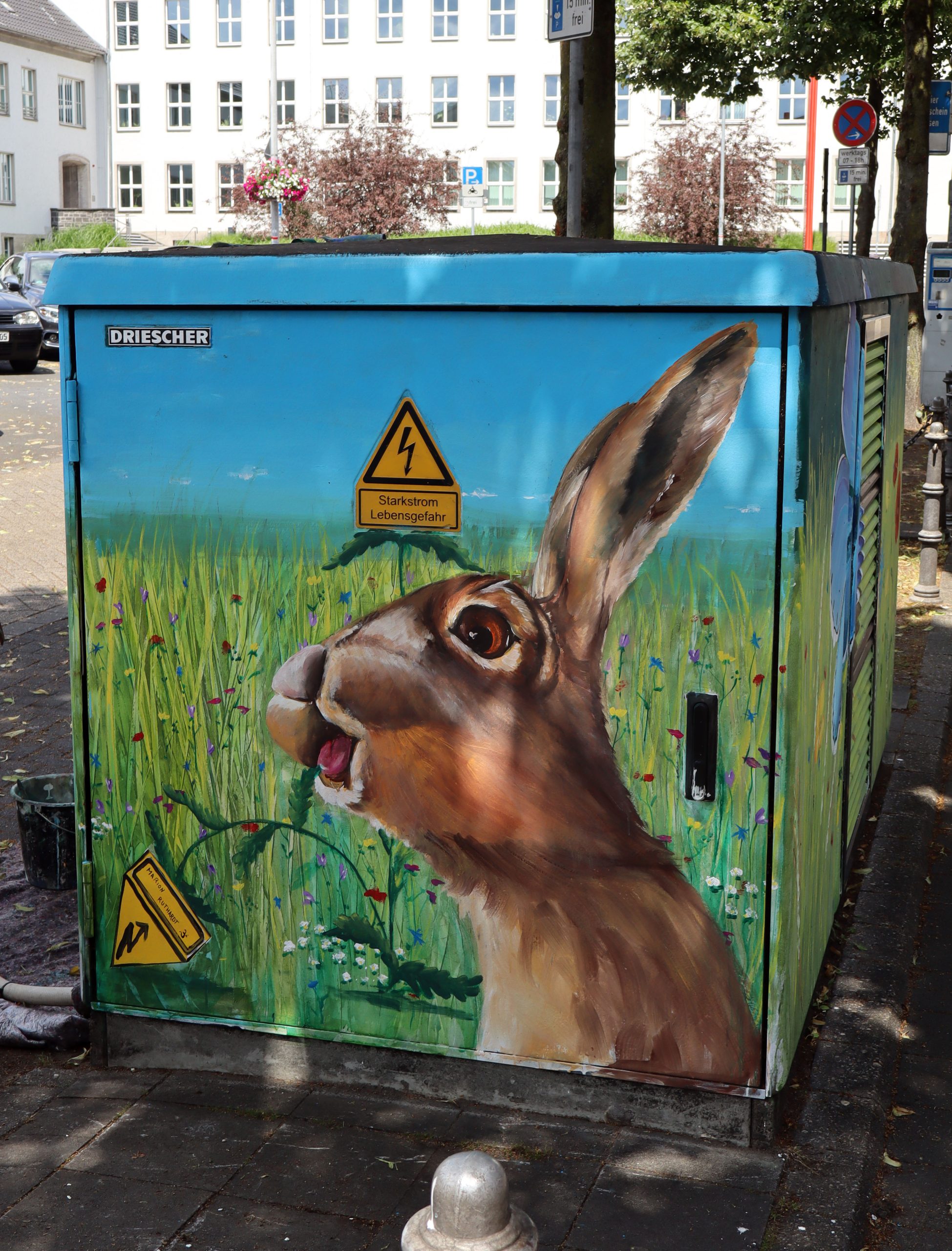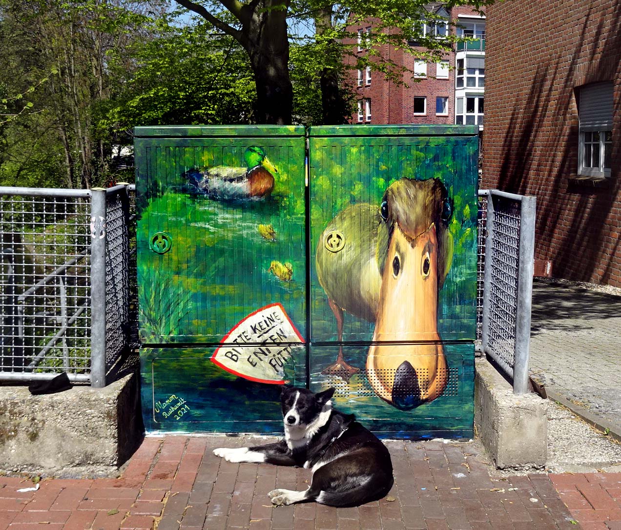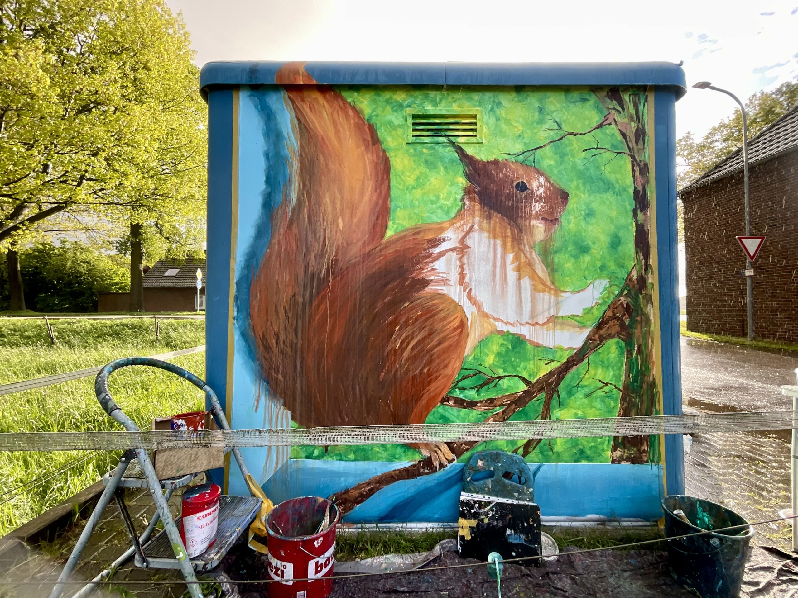 Es fing an, mit der Anfrage, ob ich im schönem, niederrheinischem Städtchen Moers die Stromkästen verschönern könnte. Ich habe es immer vor mir her geschoben, denn das war ist ja wieder eine ganz andere Baustelle. Wie grundiert man, wie fixiert man, und dann noch sooo klein zu malen, bin ich ja gar nicht gewöhnt. Durch Covid hatte ich dann im Herbst eine große Lücke, und habe mit den Kästen angefangen. Und siehe da, es hat mir mega Spaß gemacht!