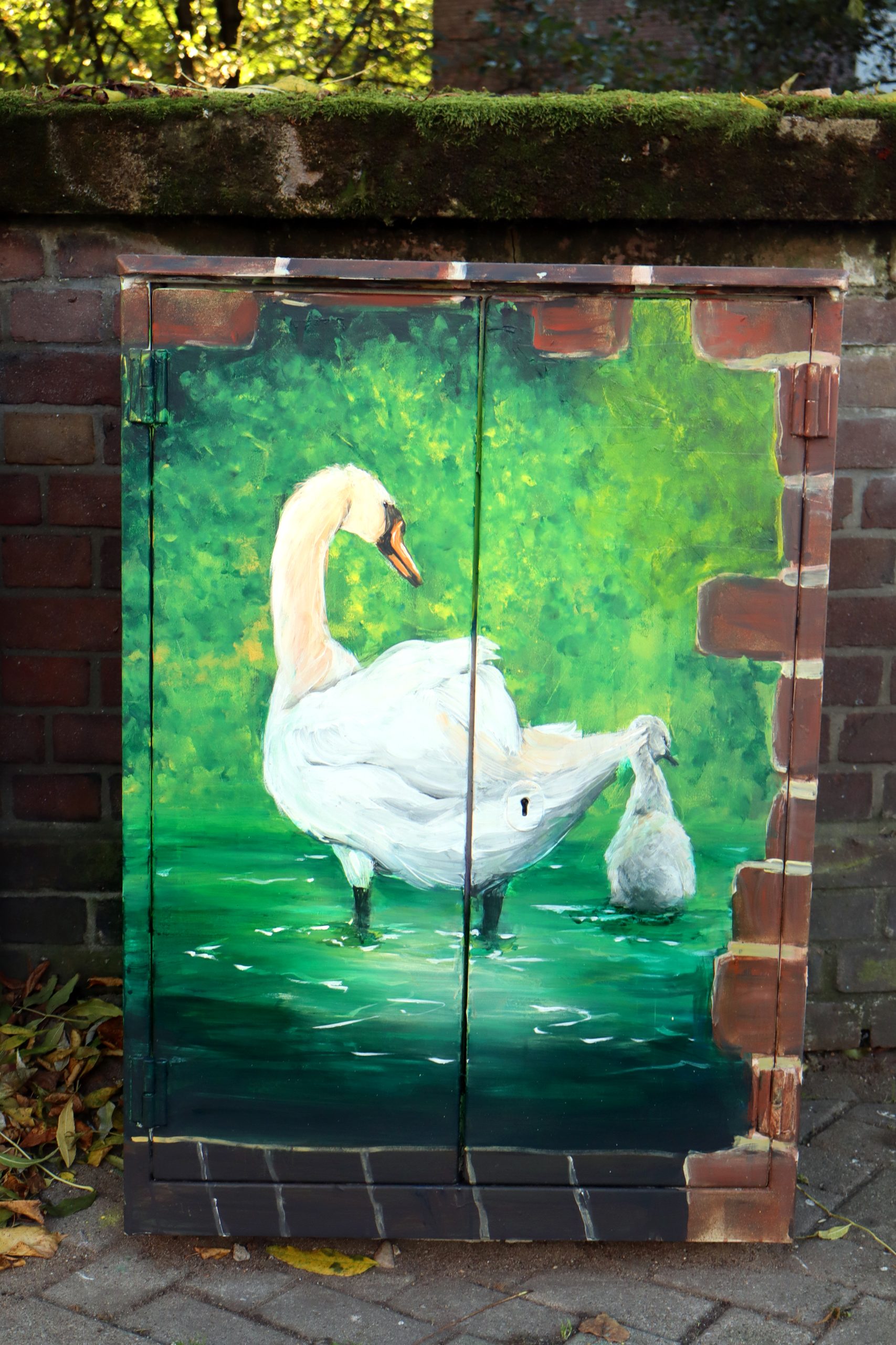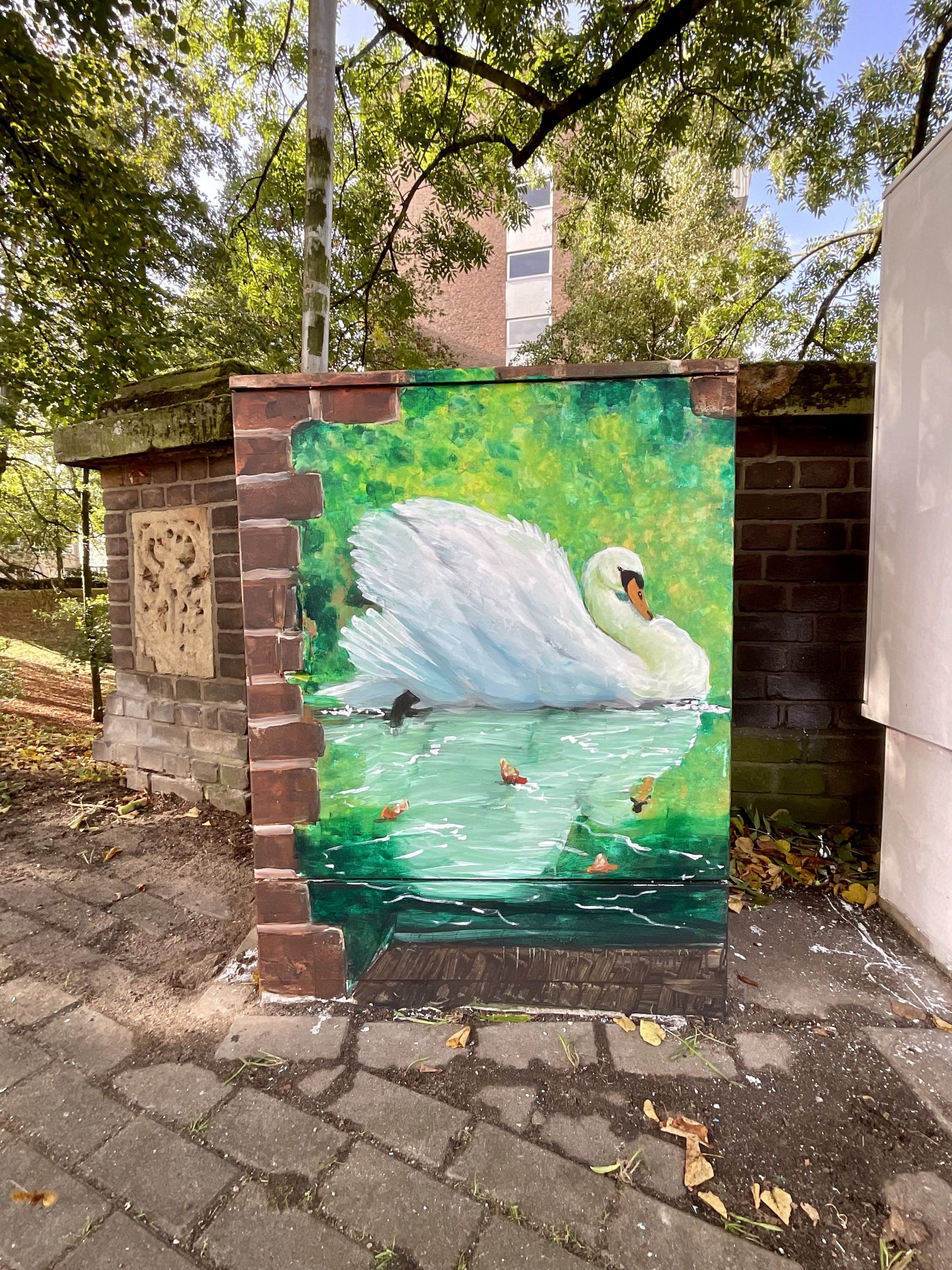 Diese 3 Stromkästen stehen Ecke Hagstraße,, Richtung Amtsgericht Moers. Ebenso ist das ein Eingang zum Schloßpark. In dem auch Schwäne eine große Rolle spielen –leider wurde ein Schwanenpaar schmerzlich vermißt, aber tatsächlich, genau während ich dort malte, stellte sich Schwanen – Nachwuchs ein.