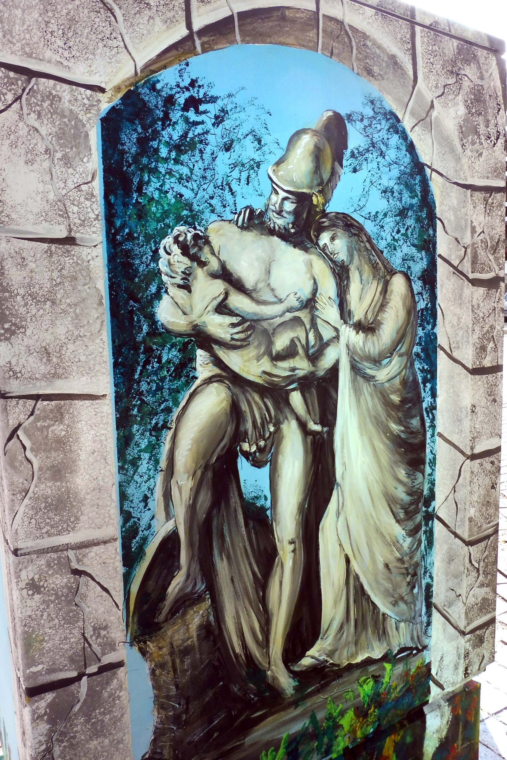 - Bild – Hektors Abschied — Diese Statue wurde 1882 von Carl Cauer (1828-1885) geschaffen. Sie wurde am 1. Mai 1933 feierlich im Schlosspark aufgestellt. Das Denkmal zeigt Hektor , wie er sich von seiner Frau und seinem Kind verabschiedet, um in den trojanischen Krieg zu ziehen. Hektor war der älteste Sohn des Königs von Troja und Heeresführer Trojas. Hektor kämpfte vor den Mauern Trojas gegen den Griechen Achilleus und wurde von ihm getötet