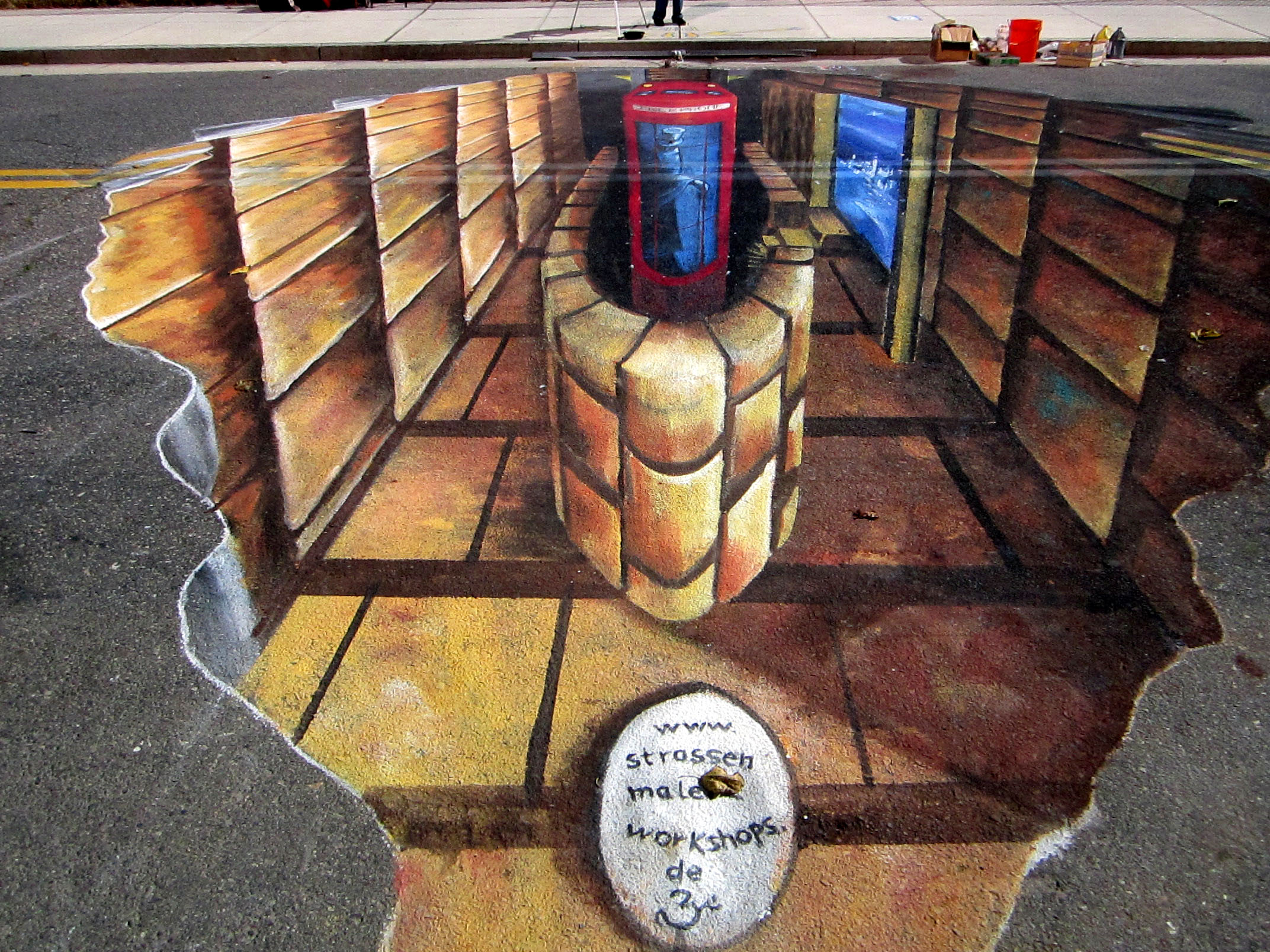 Links, erste Gehversuche am Kölner Dom und in Geldern, hauptsächlich mit klassischer Kopie. Es half viel, daß ich erfolgreich war, und in die Meisterklasse aufstieg. Sowohl hier, wie auch auf anderen Festivals, zum Beispiel in Mantua, Bodenwerder und Wilhemshaven. Plötzlich änderte sich alles, als der Amerikaner Kurt Wenner darauf kam, anamorphisch eBilder auf die Straße zu bringen. Julian Beever griff das auf, und wurde in den Anfängen des Internets ohne eigene Homepage zur Internet Ikone, da seine Bilder sich als Selbstläufer verteilten. So änderte sich auch meine Arbeit, Agenturen und Festivals fragen nur noch nach 3d.